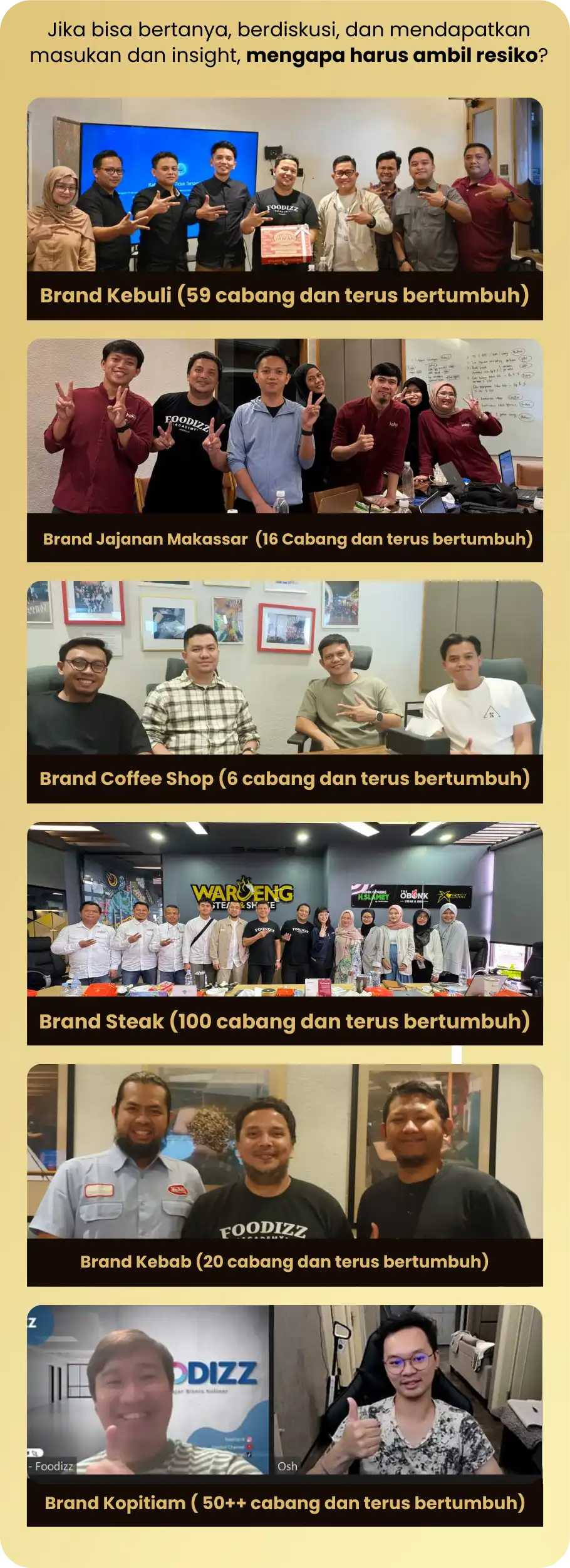 Brand-Brand seperti  Haus Indonesia, Sambal Bakar Indonesia, Jabarano Coffee, Agreya Coffee, Padang Payakumbuah, Sarae Bakes, Kaku Food, Humble Baker, EsTeh Indonesia, Waroeng Steak & Shake, Susu Mbok Darmi dan Ribuan Brand lainnya yang sudah pernah join di berbagai kelas dan workshop Foodizz Academy, Anda tidak perlu ragu lagi soal Kualitas Pengajar dan Konten yang di ajarkan oleh Foodizz Academy. ๐Ÿ‘‡ ๐Ÿ‘‡